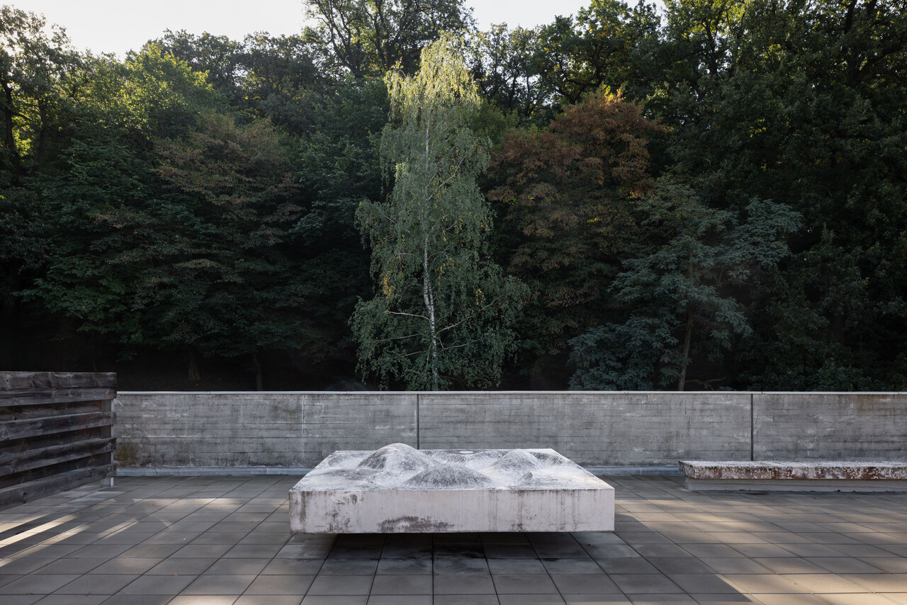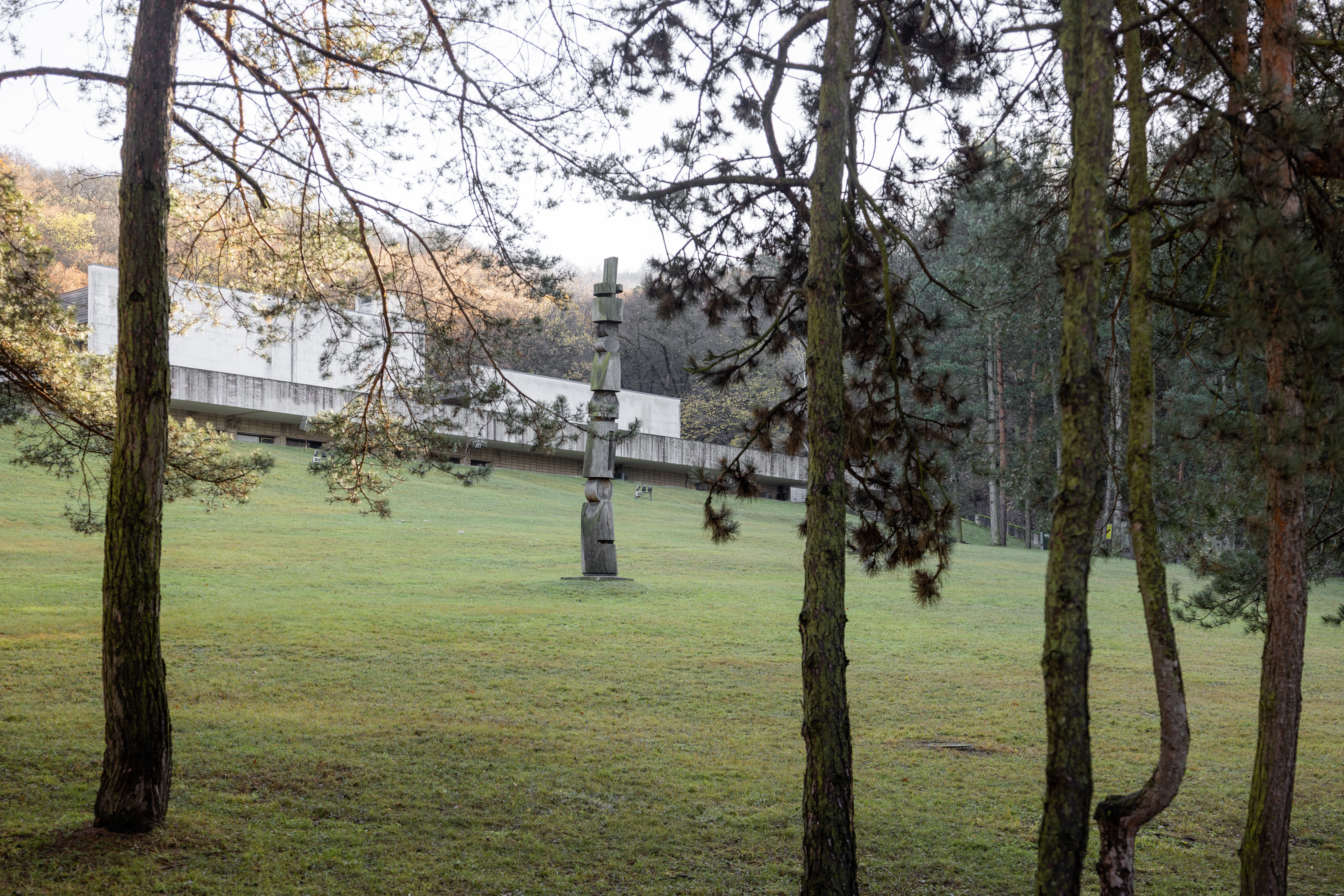 Štylizovanú postavu smútiacej ženy na kubusovom podstavci osadili na trávniku v priestore Rozptylovej lúčky. Pozadie pietneho miesta tvoria osekané kamenné zrázy, pôvodne kameňolom, ktorý architekt geniálne zapracoval do projektu. Ostré a drsné kamenné steny kontrastujú s jemnou, mäkkou formou smútiacej postavy. Spolupráca architekta a sochára priniesla do priestoru atmosféru intimity a tichého zamyslenia.