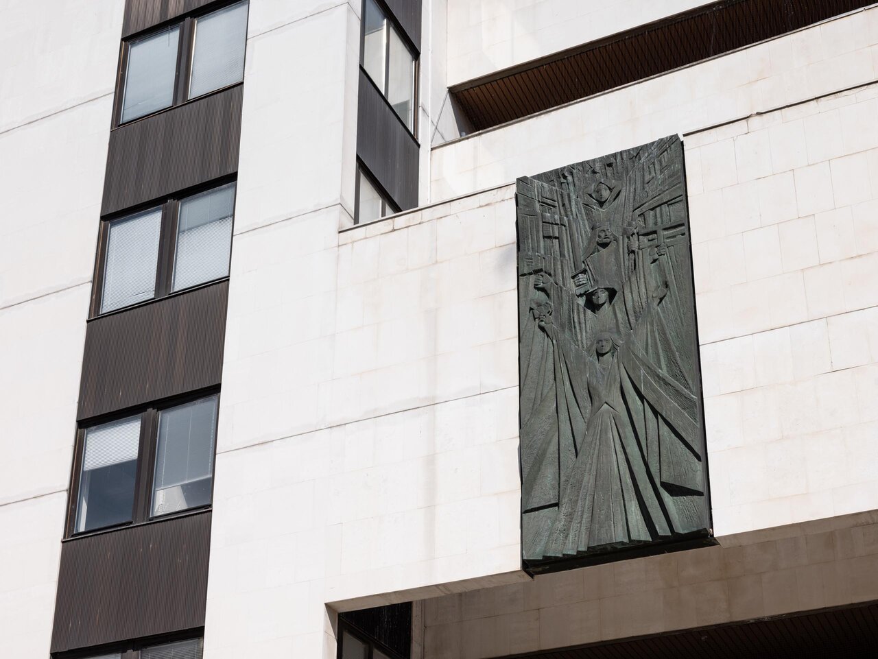 Napriek tomu, že budova má skôr uzavretý charakter, čo si vyžiadala najmä jej funkcia, účinne komunikuje s okolitým mestským prostredím pomocou výtvarného diela, ktoré tlmočí hlavné posolstvo budovy. Reliéf A. Trizuljaka s názvom Vôľa ľudu, niekedy nazývaný aj Zákon z vôle ľudu, je asymetricky osadený nad vstupom na konzolovito vysunutom dekoratívno-architektonickom článku. Odvážna konštrukcia ozvláštňujúca vstupnú časť je obložená svetlým mramorom z lomu Kanfanar v Chorvátsku.